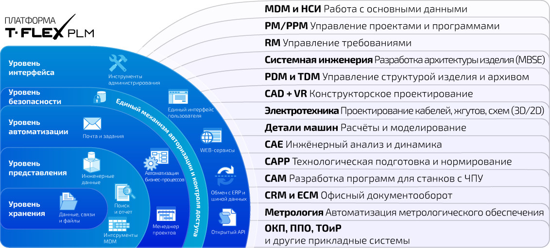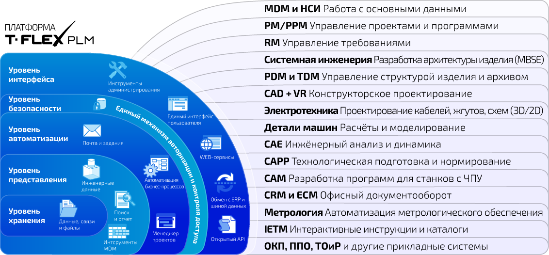 - Высокая цифровая связанность – все модули T-FLEX PLM: PM | RM | CAD | ECAD | CAM | CAE | PDM | TDM | CAPP | IETM, работают на общей платформе, что позволяет контролировать любые изменения данных и актуализировать информацию без потерь, на любом этапе жизненного цикла изделия.